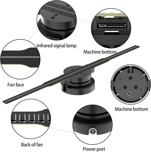 The low-power DC brushless motor runs quietly at high RPM to reduce shadow ripple, so customers focus on the hologram, not the fan.